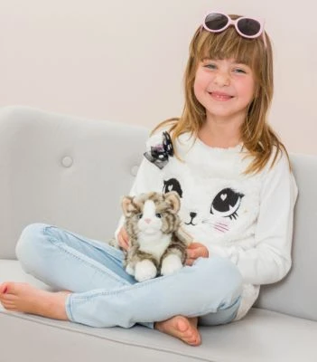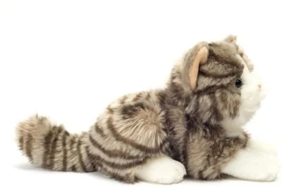 Der kleine sanfte Vierbeiner aus der Hermann Teddy Collection liegt am liebsten auf dem Bett und möchte gestreichelt werden! Die liegende Katze steht kleinen Kätzchen-Fans zum Kuscheln, Spielen, Erzählen und Liebhaben allzeit zur Verfügung und wird somit zu einem stetigen Begleiter und Tröster in der Not! Rasend schnell wird sich die kuschelweiche Katze mit ihrem hübsch getigerten Fell in die Herzen schmusen! Da der Hersteller Teddy-Hermann höchsten Wert auf Qualität legt, erfüllt die Katze alle gegenwärtigen Sicherheitsanforderungen und ist gegenüber allen großen und kleinen Hürden, Gefahren und Abenteuern des Kinderalltags gewappnet. Sie besteht aus hochwertigem Wirkplüsch und ist mit weicher Polyesterwatte aus 100% recyceltem Kunststoff gefüllt.